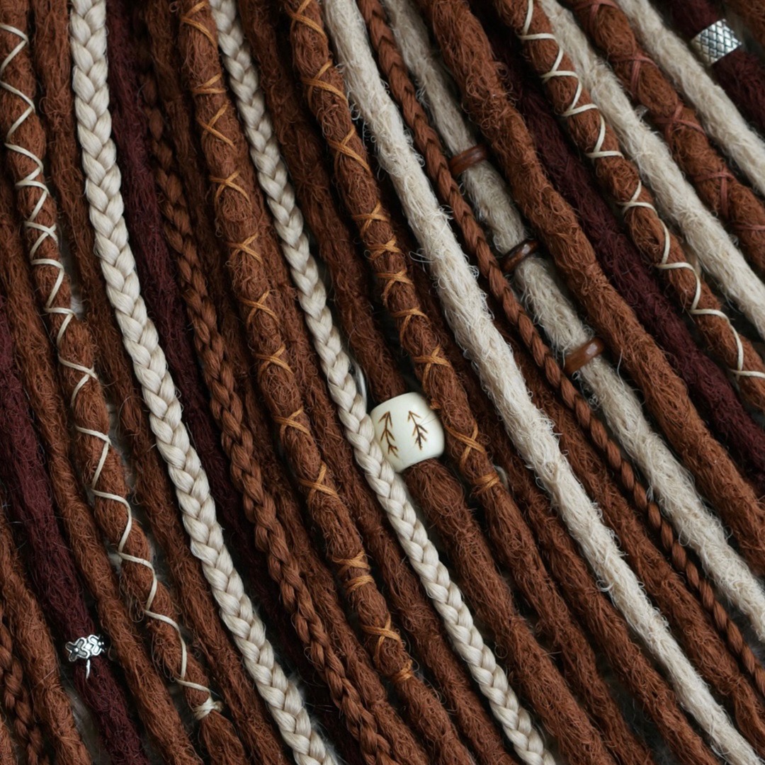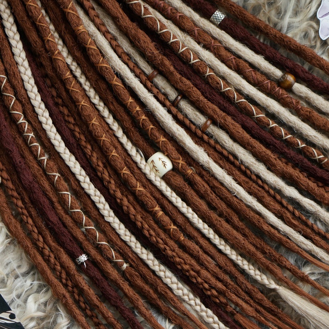 Комплект изготовлен из канекалона высокого качества, ручная смешка нескольких медных и светлых оттенков. В составе: прямые крючковые де-дреды и де-косы. Комплект износостойкий и не потребует коррекции как минимум пару вплетений, а если вам захочется дополнительно его украсить, то большое количество бусин, подвесок и колец вы можете найти в нашем магазине в разделе «Украшения», также у нас большой выбор полосок и шапок для дред!