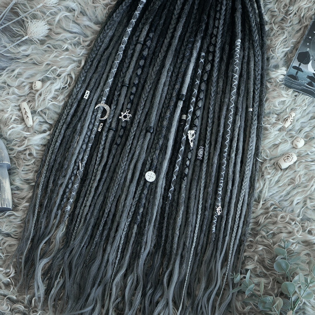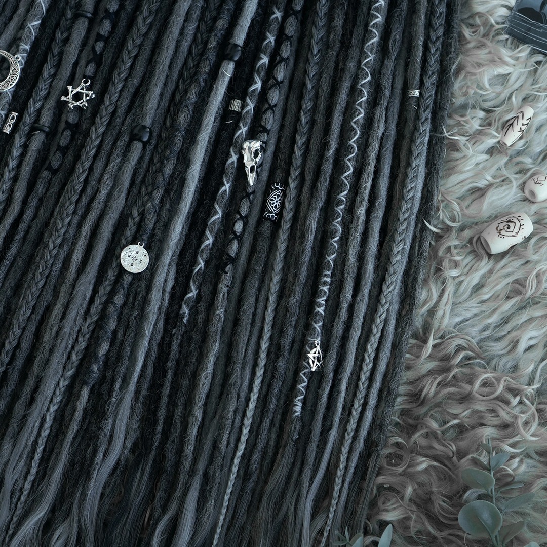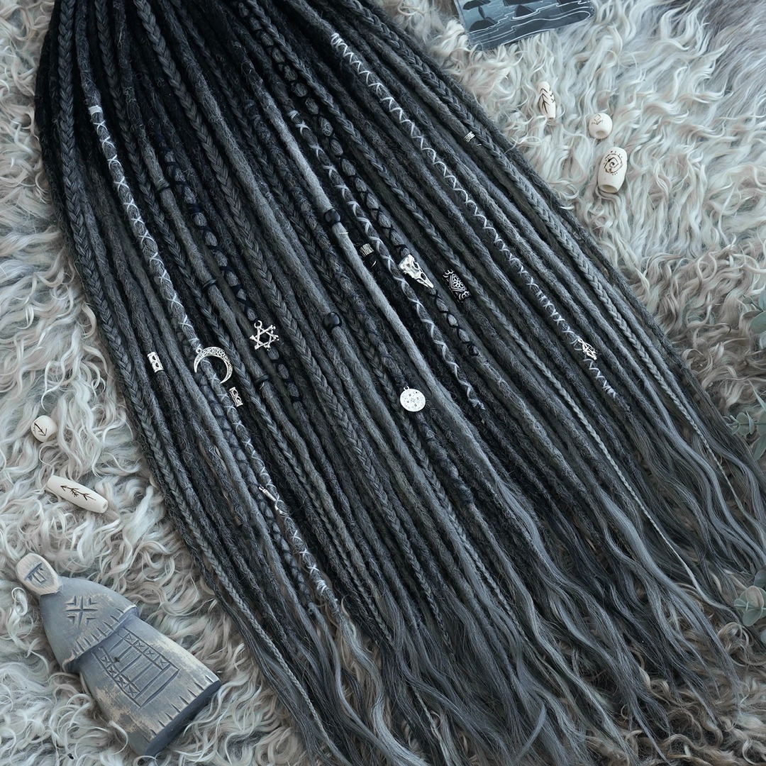 Комплект изготовлен из канекалона высокого качества, ручная смешка черных и нескольких серых цветов. В составе: прямые крючковые де-дреды и де-косы. Комплект износостойкий и не потребует коррекции как минимум пару вплетений, а если вам захочется дополнительно его украсить, то большое количество бусин, подвесок и колец вы можете найти в нашем магазине в разделе «Украшения», также у нас большой выбор полосок и шапок для дред!