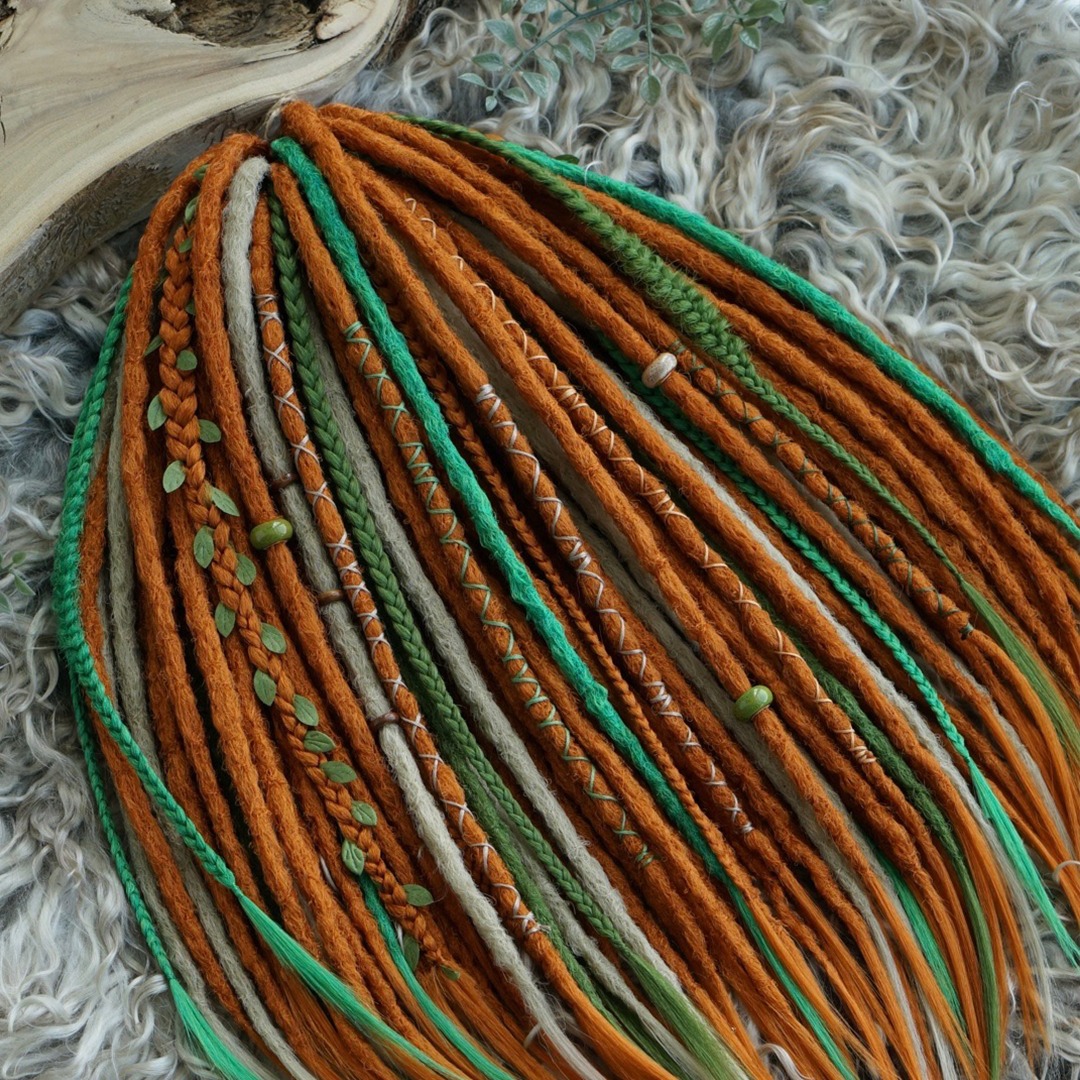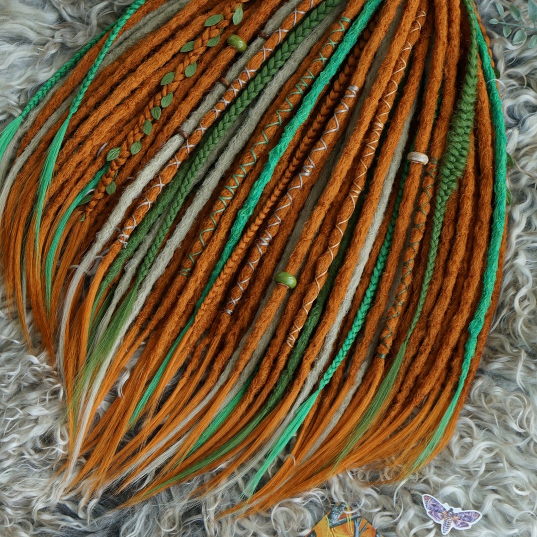Комплект изготовлен из канекалона высокого качества, ручная смешка рыжего, серого и нескольких зеленых оттенков. В составе: прямые крючковые де-дреды, де-косы и фактурные декоративные косички. Комплект износостойкий и не потребует коррекции как минимум пару вплетений, а если вам захочется дополнительно его украсить, то большое количество бусин, подвесок и колец вы можете найти в нашем магазине в разделе «Украшения», также у нас большой выбор полосок и шапок для дред!