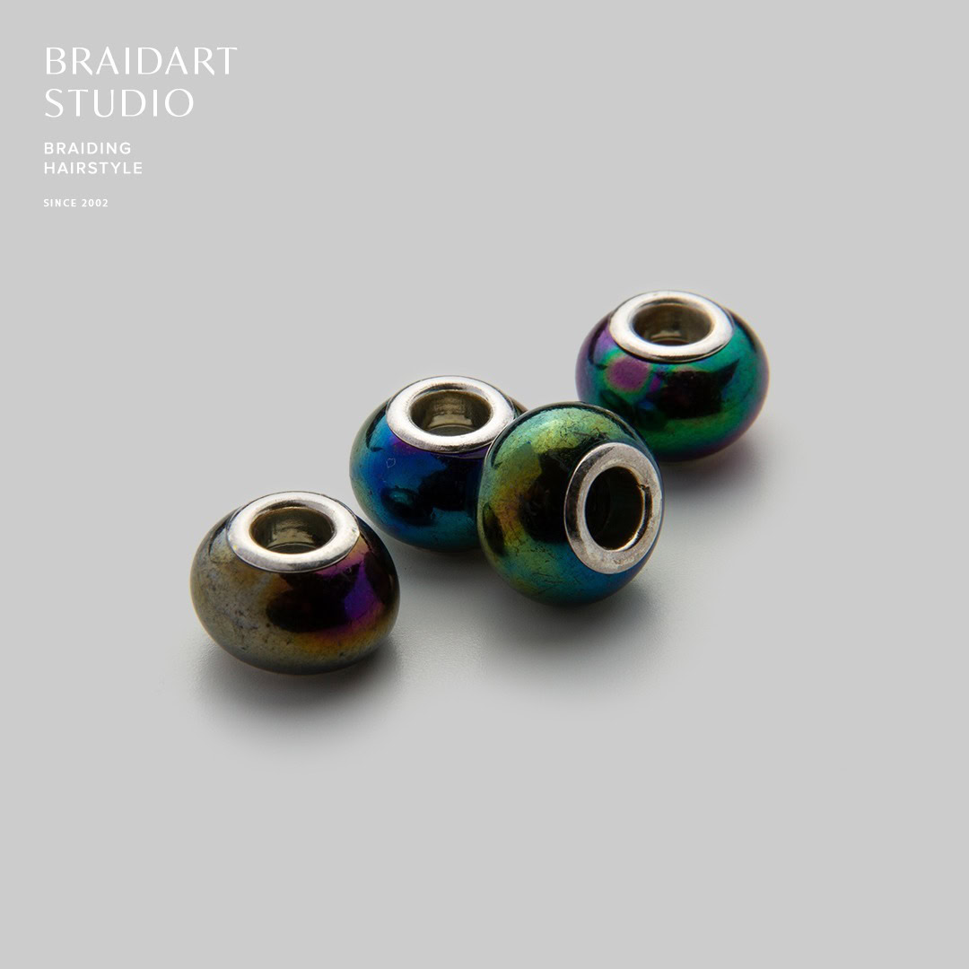 Керамическая бусинка темного цвета с бензиновым отливом отлично подходит для любого типа дред, кос и других афропричёсок.