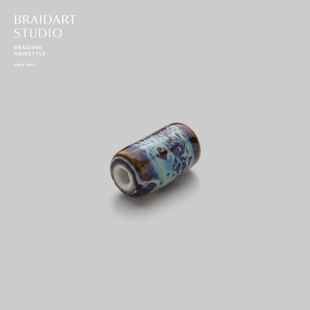 Вытянутая керамическая бусинка с миниатюрным отверстием, с переливами коричневых, голубых и белых оттенков.