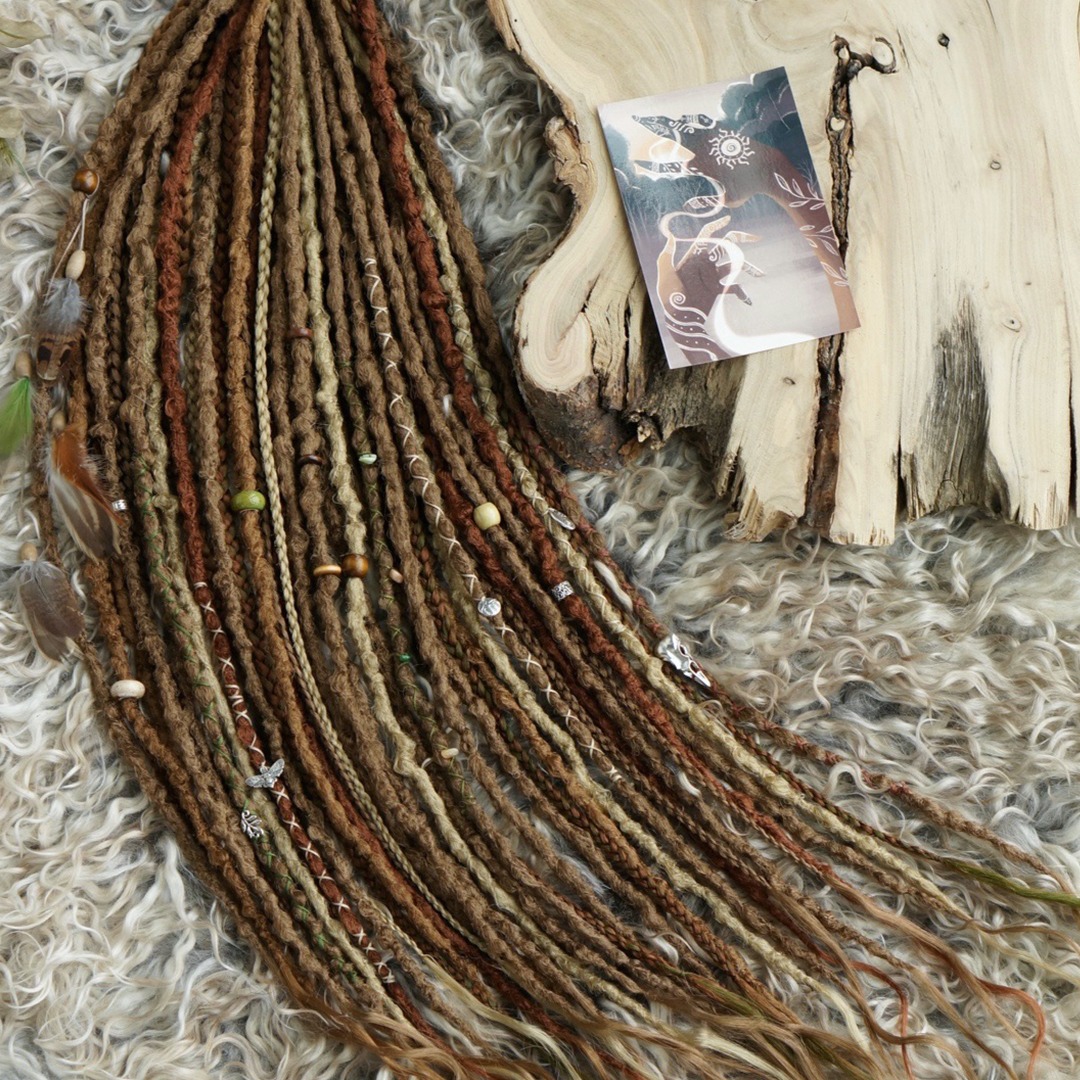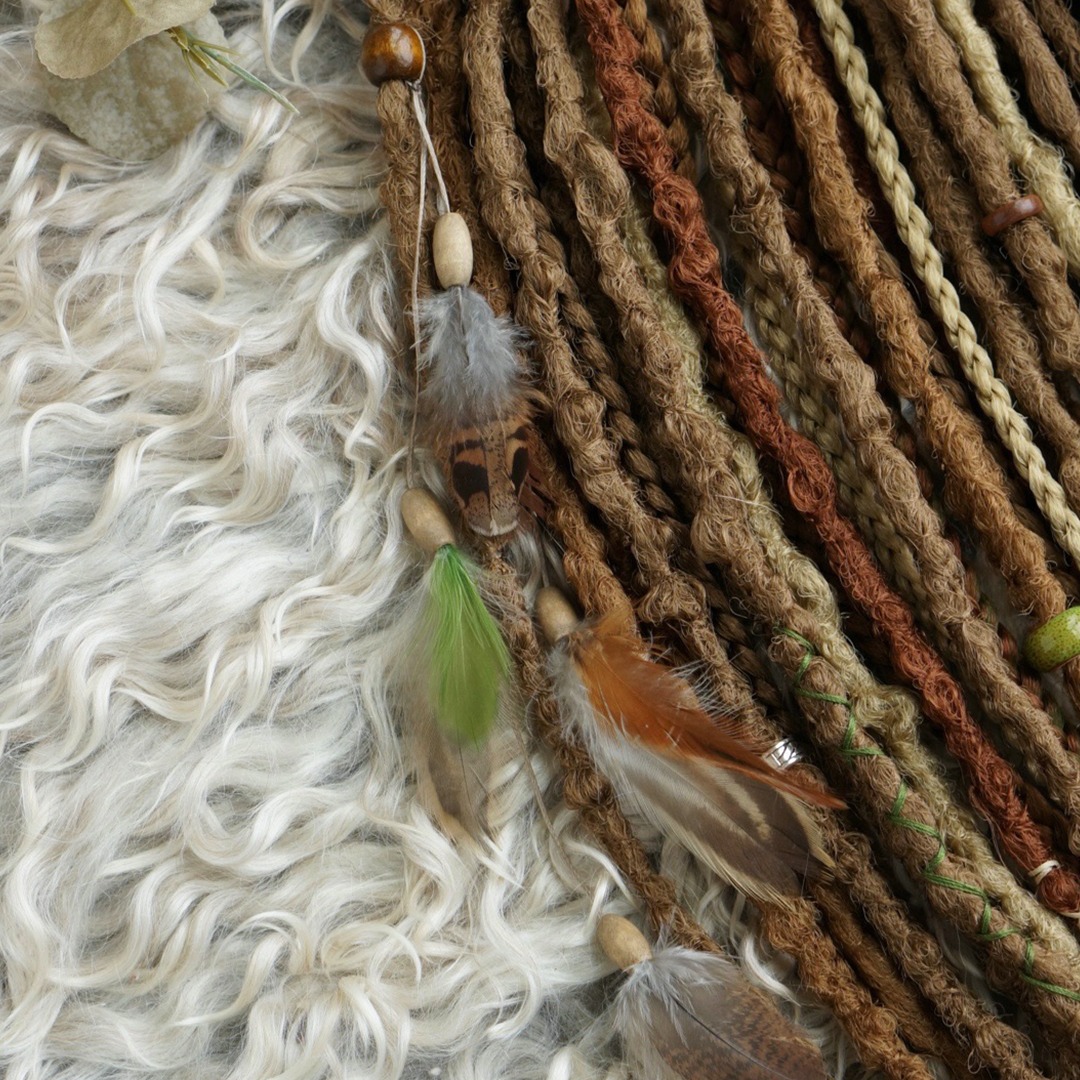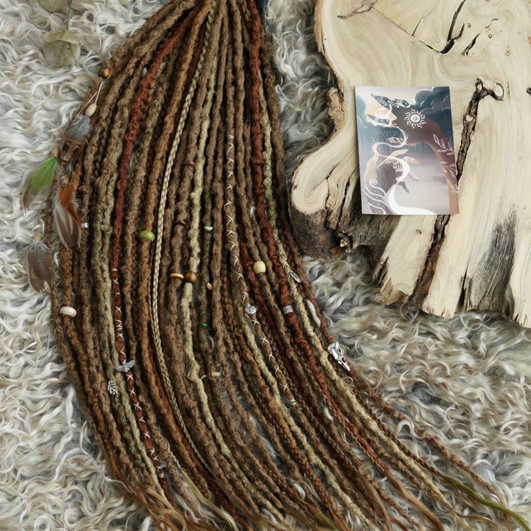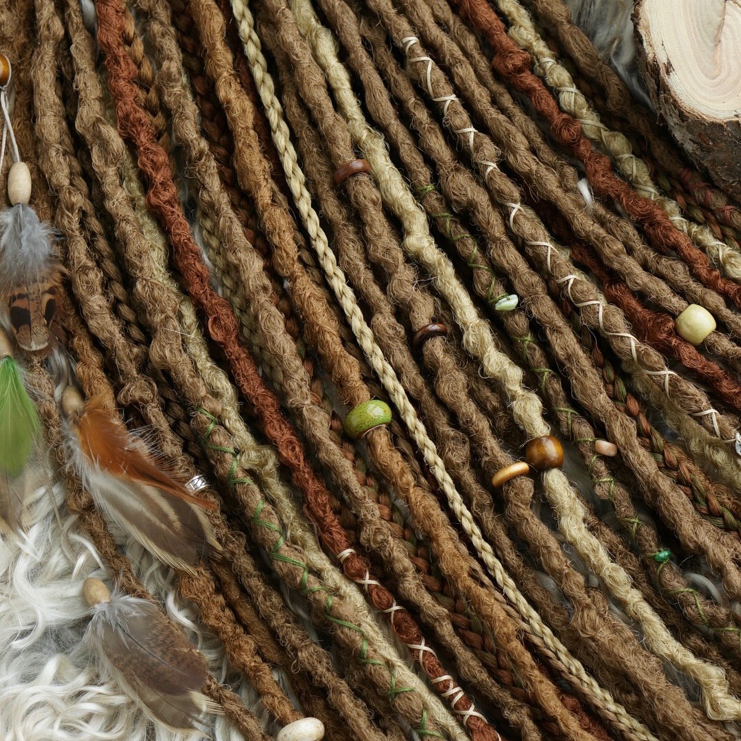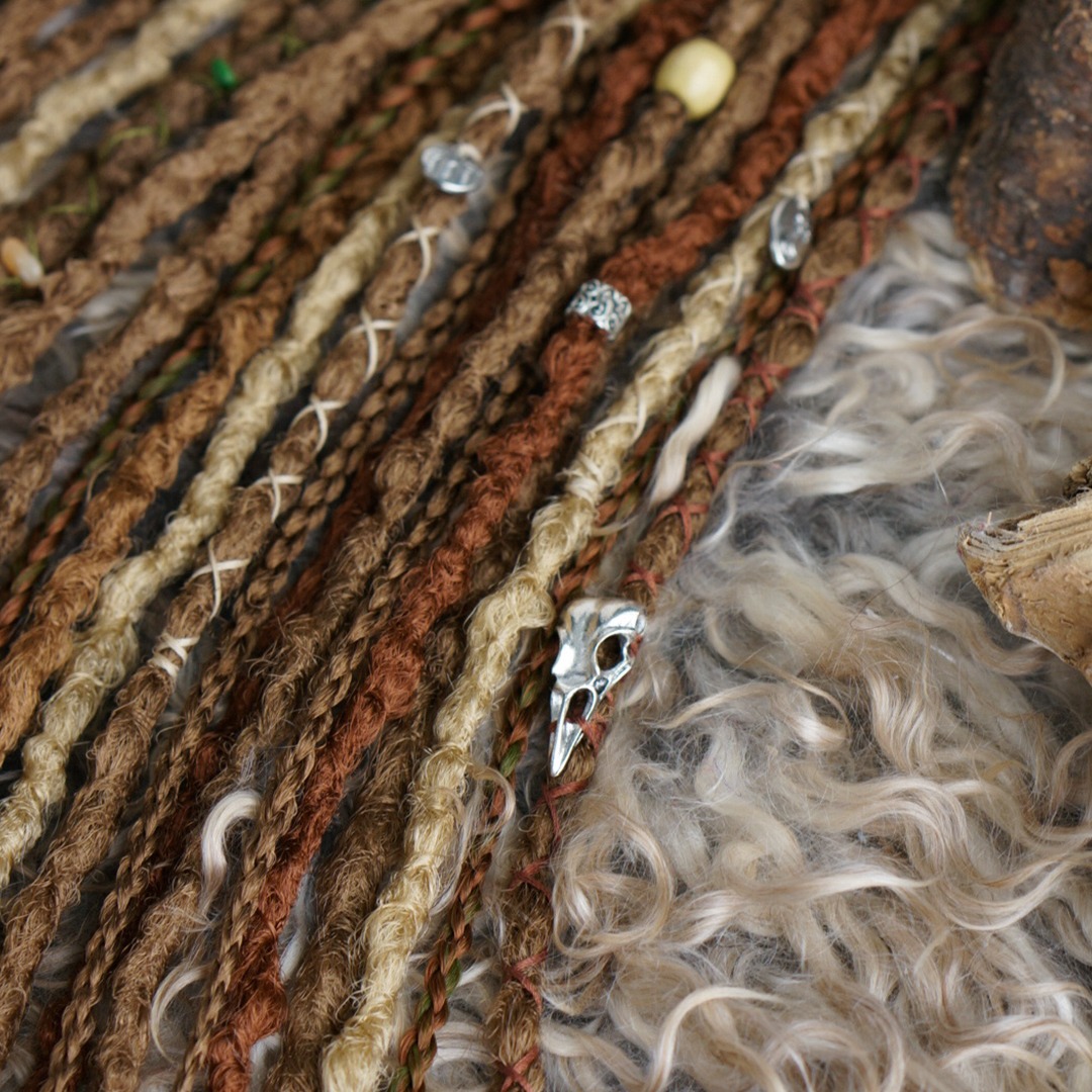 Необычный лесной бохо-комплект дред в спокойной русой гамме с добавлением медных и светлых акцентов. Срок носки – до двух месяцев.