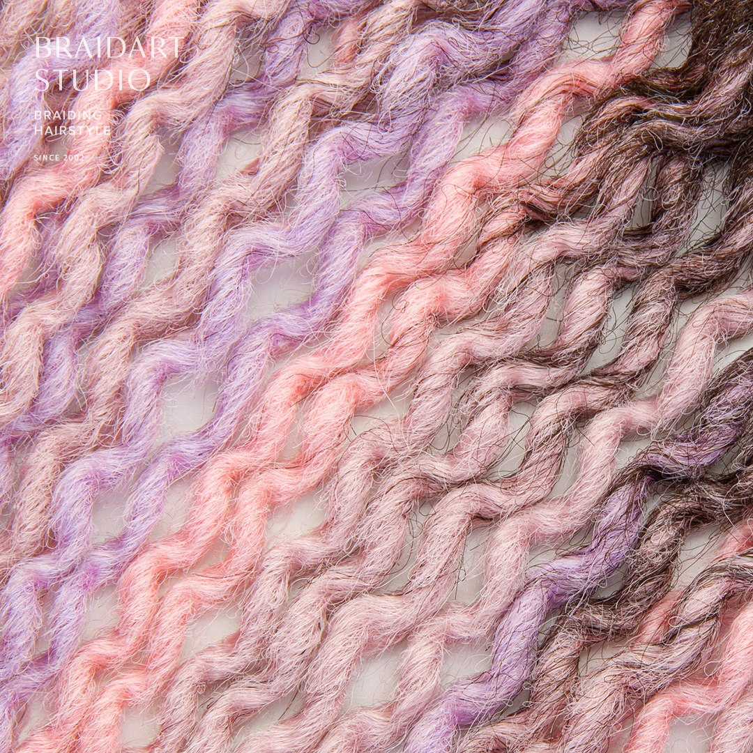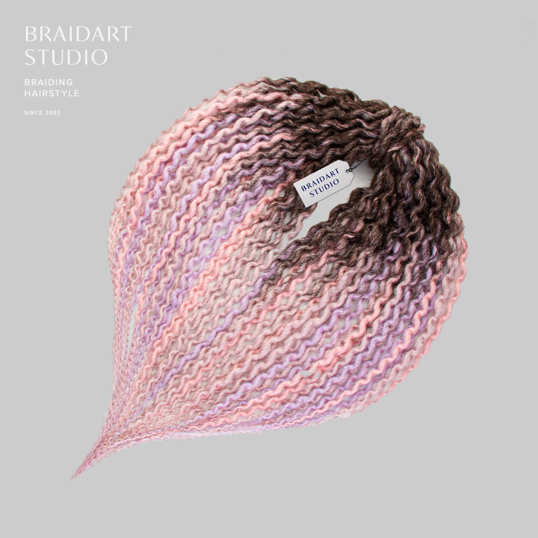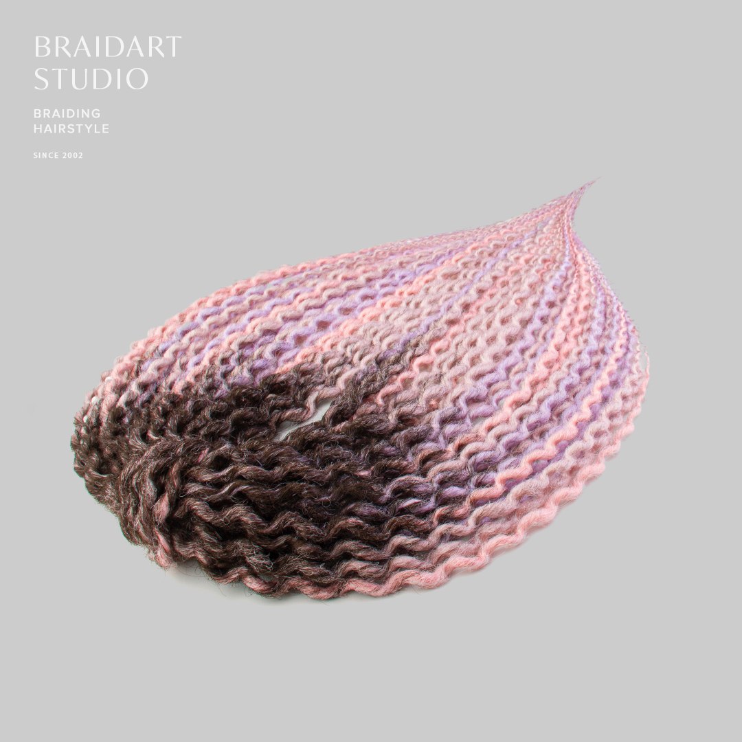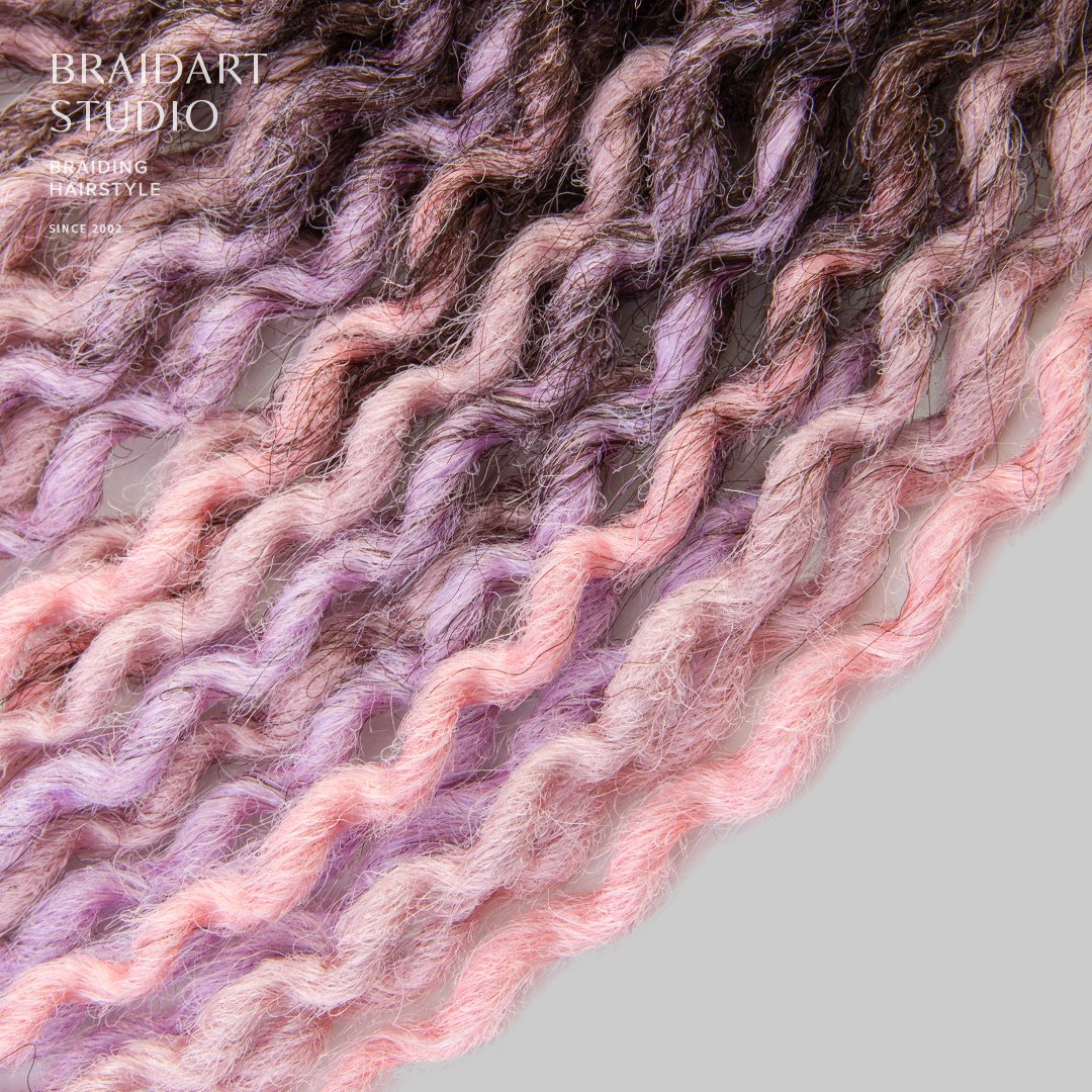 Многоразовый комплект завитых дред в розовых и сиреневых оттенках, объёмный и аккуратный. Срок носки до двух месяцев.