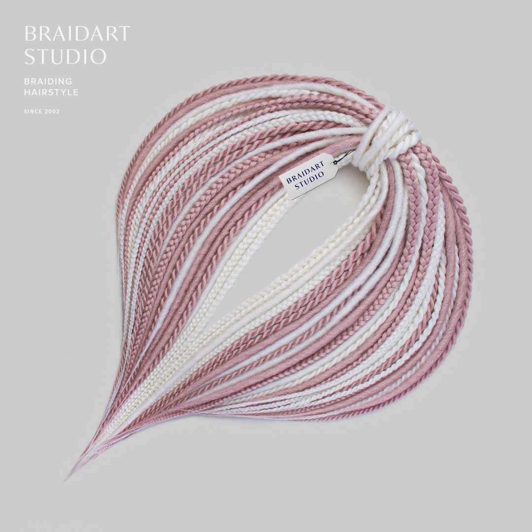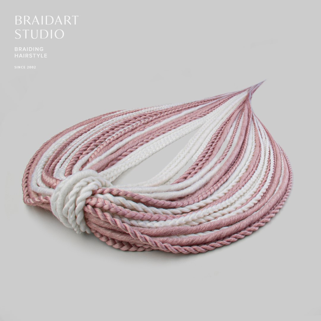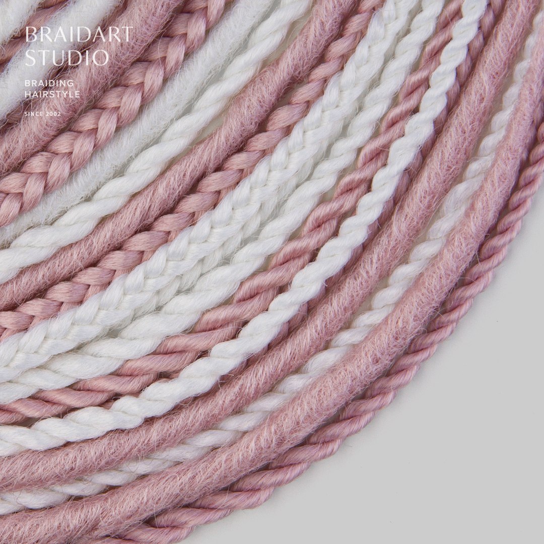 Комплект изготовлен из высококачественного материала, ручная смешка из белого и приглушённого розового цветов. В комплекте: гладкие дреды, де-спиральки и де-косы. Комплект износостойкий и не потребует коррекции как минимум пару вплетений. Если вам захочется дополнительно украсить комплект безопасных дред, то большое количество бусин, подвесок и колец вы можете найти в нашем магазине в разделе «Украшения», также у нас большой выбор полосок и шапок для дред!
