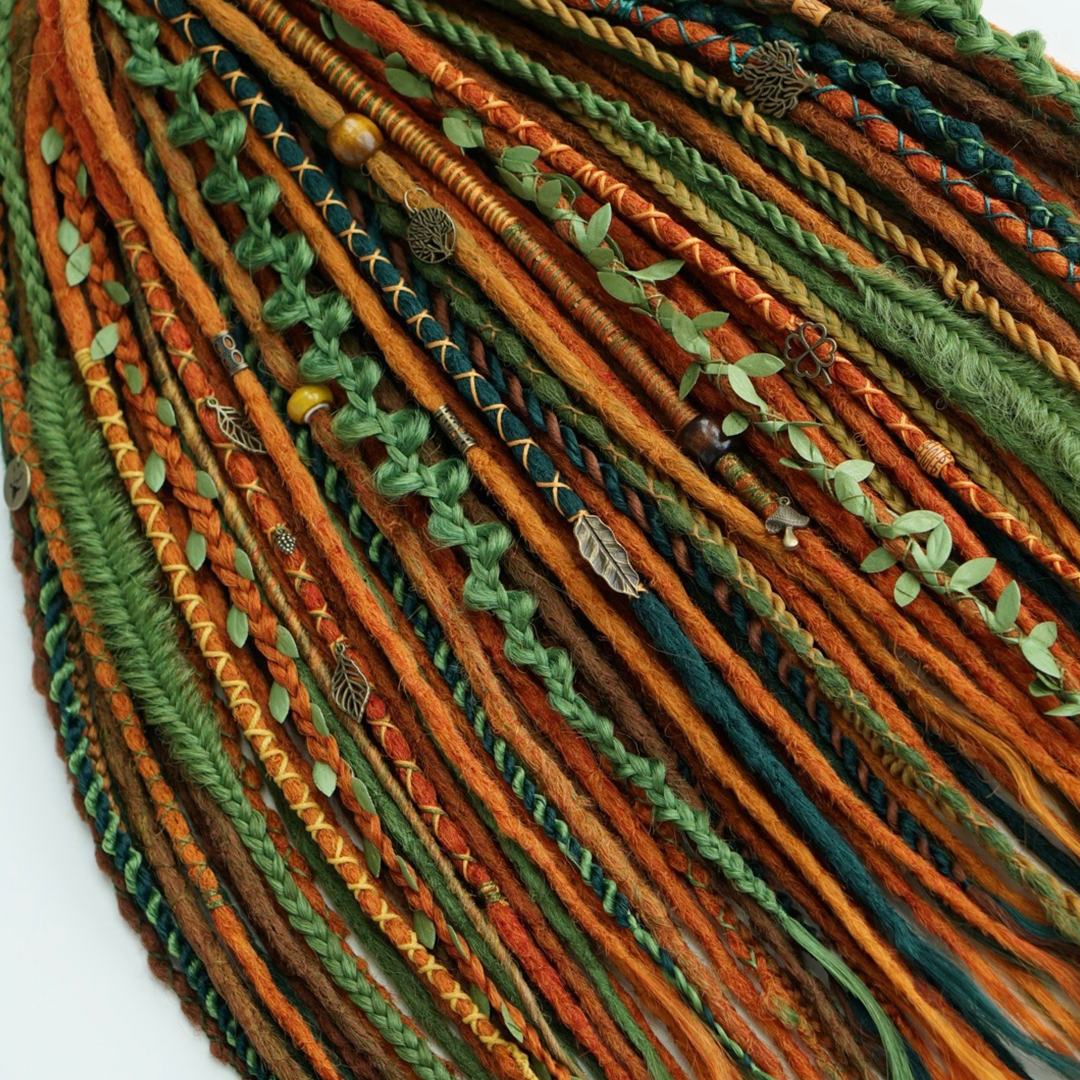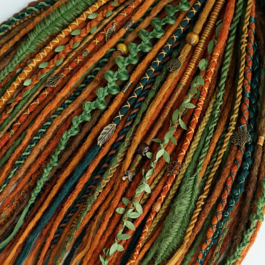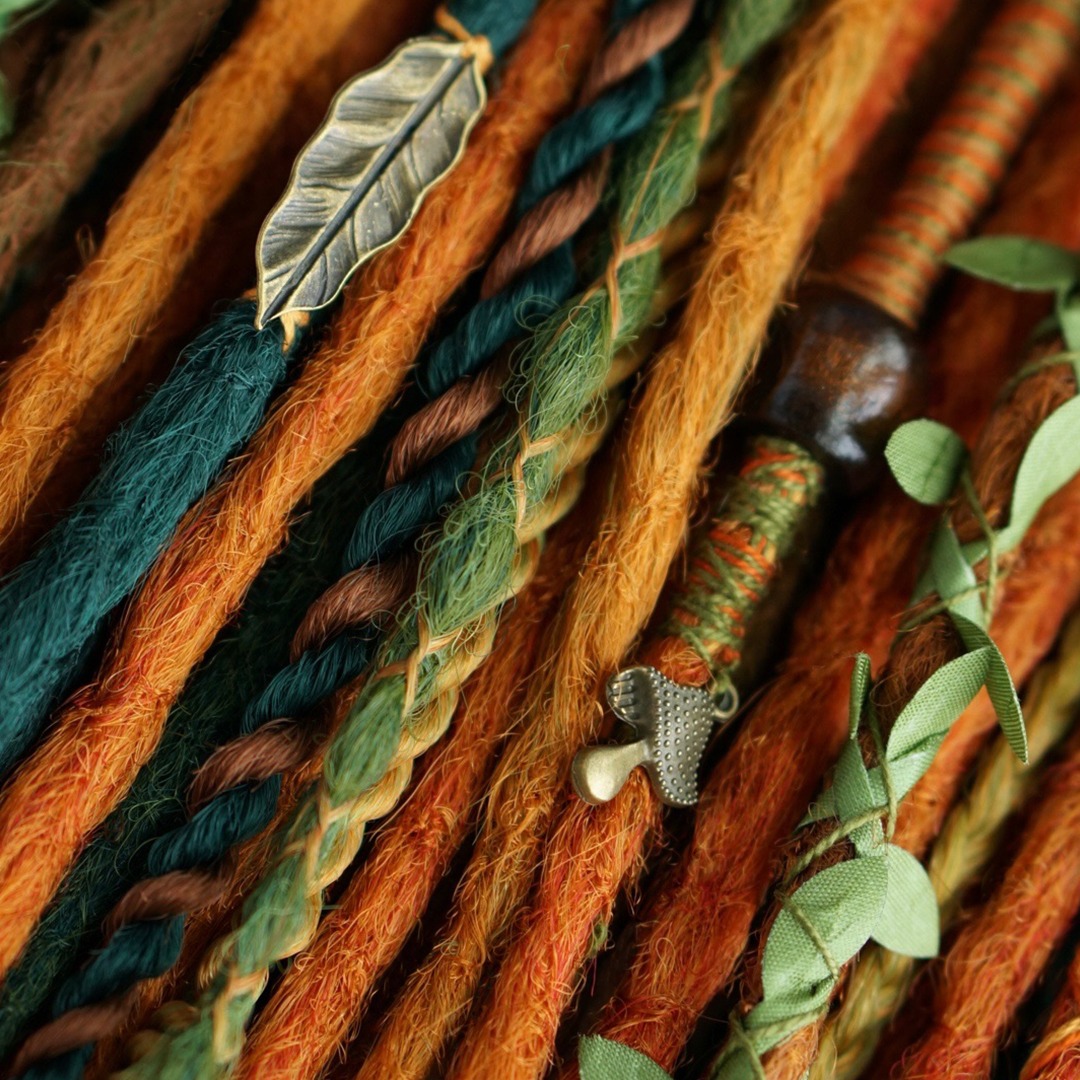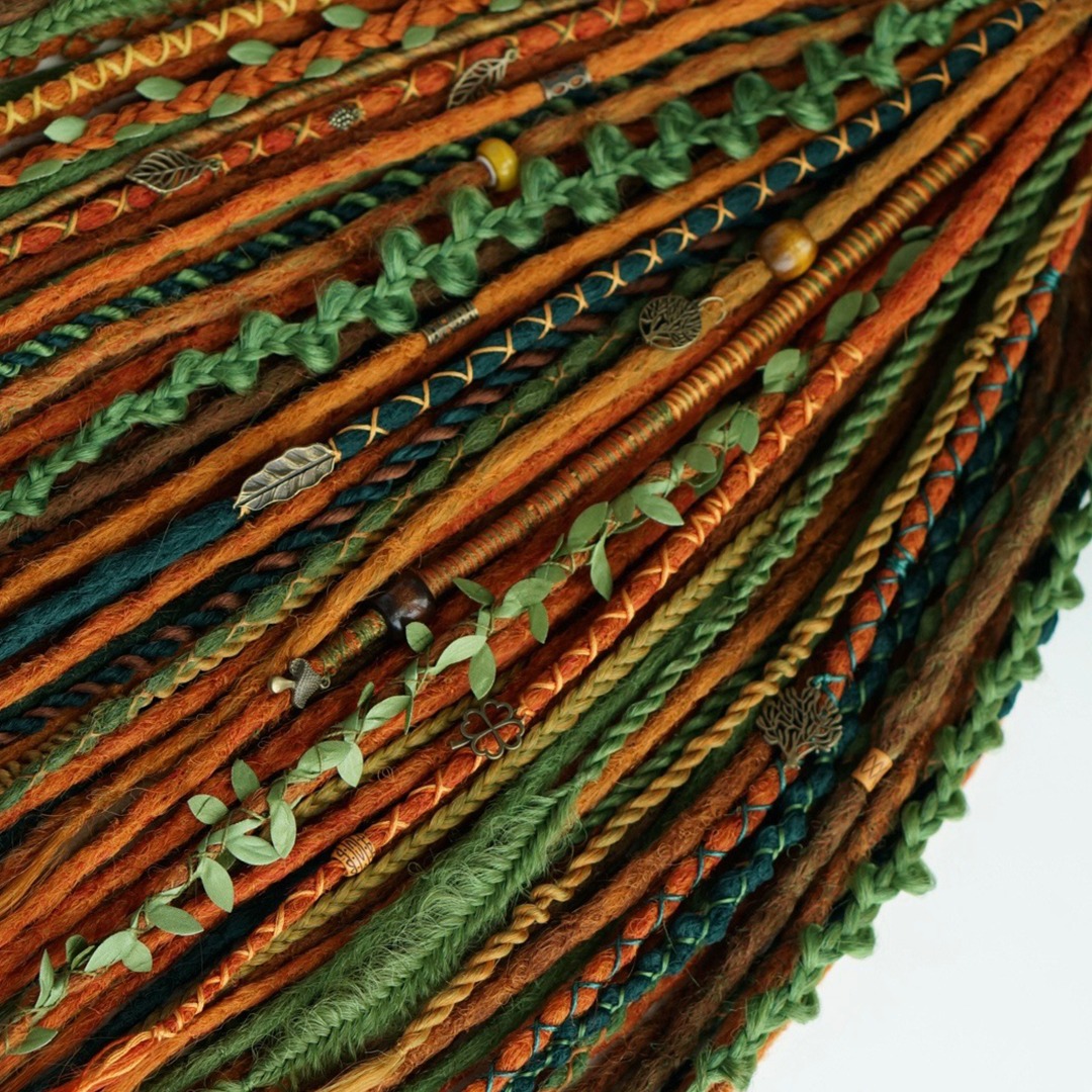 Комплект изготовлен из канекалона высокого качества, ручная смешка рыжего, медного и нескольких зеленых и темно-синих оттенков. В составе: прямые крючковые де-дреды, де-косы, де-спиральки и фактурные декоративные косички. Комплект износостойкий и не потребует коррекции как минимум пару вплетений, а если вам захочется дополнительно его украсить, то большое количество бусин, подвесок и колец вы можете найти в нашем магазине в разделе «Украшения», также у нас большой выбор полосок и шапок для дред!